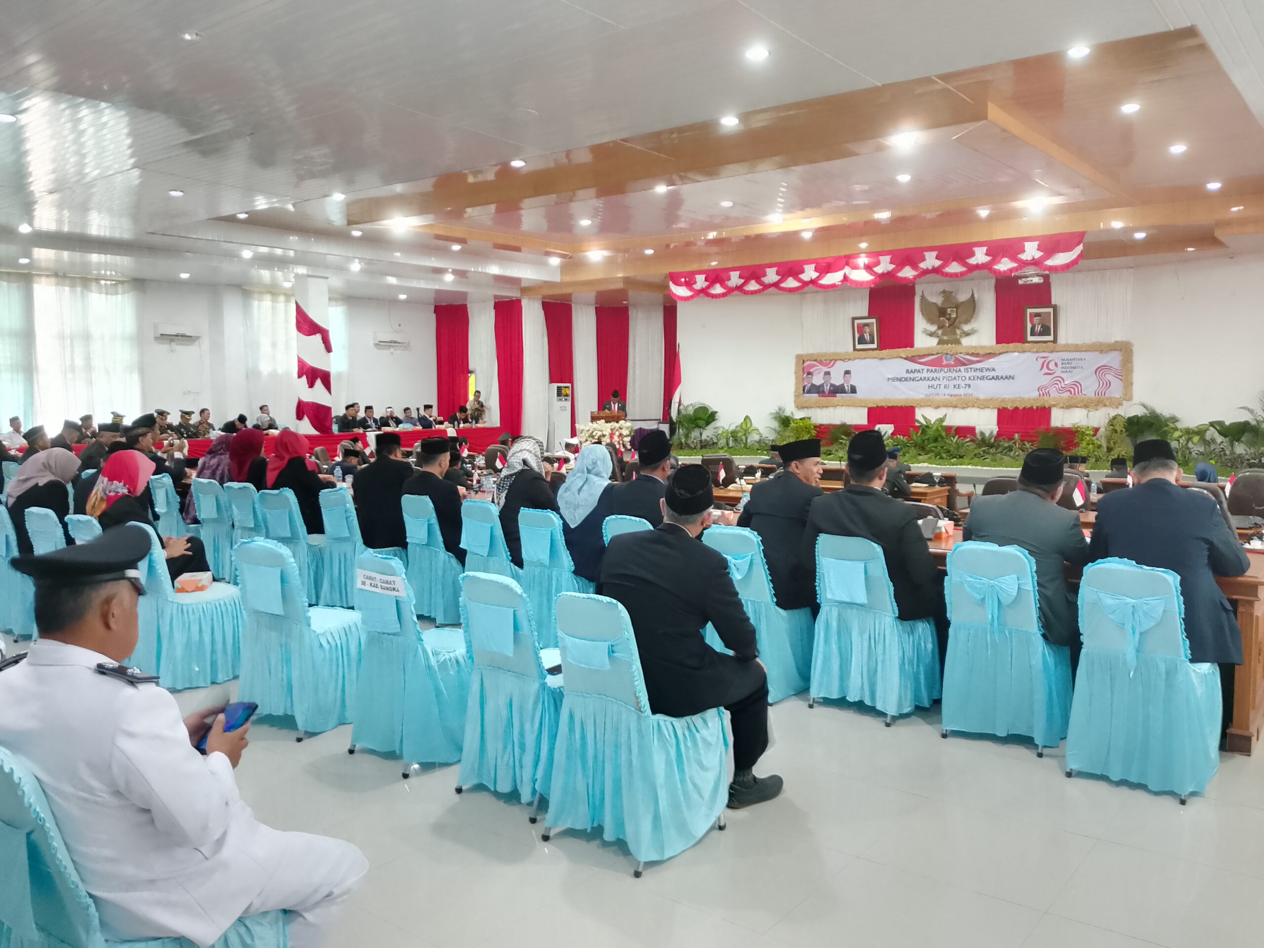 SUNGAILIAT LBC – DPRD Kabupaten Bangka menggelar rapat Paripurna Istimewa Mendengarkan Pidato Kenegaraan Presiden Republik Indonesia pada hari Selasa 16 Agustus 2024, dalam rangka memperingati HUT ke 79 kemerdekaan Republik Indonesia. Pelaksanaan rapat dipimpin langsung oleh Ketua DPRD Bangka Iskandar,SIP dan dihadiri oleh bapak Pj.Bupati Bangka Muhammad Haris. AR, AP, MM , Wakil Ketua I M.Taufik Koriyanto,SH,MH, Wakil Ketua II Rendra Basri,B.Sc, FORKOPIMDA, Plh.Sekda dan Pejabat eselon II dan III, Camat , Lurah , Tokoh Agama, Pemuda, Masyarakat, insan Pers, Pasukan Pengebar Bendera, serta tamu-tamu undangan lainya.