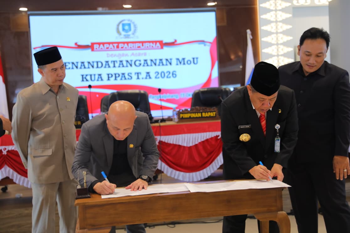 PANGKALPINANG LBC – Gubernur Kepulauan Bangka Belitung (Babel), Hidayat Arsani bersama Ketua DPRD Babel, Didit Srigusjaya menandatangani MoU KUA PPAS Tahun Anggaran 2026, melalui Rapat Paripurna di Gedung Mahligai Rumah Dinas Gubenur, Rabu (15/10/2025).
