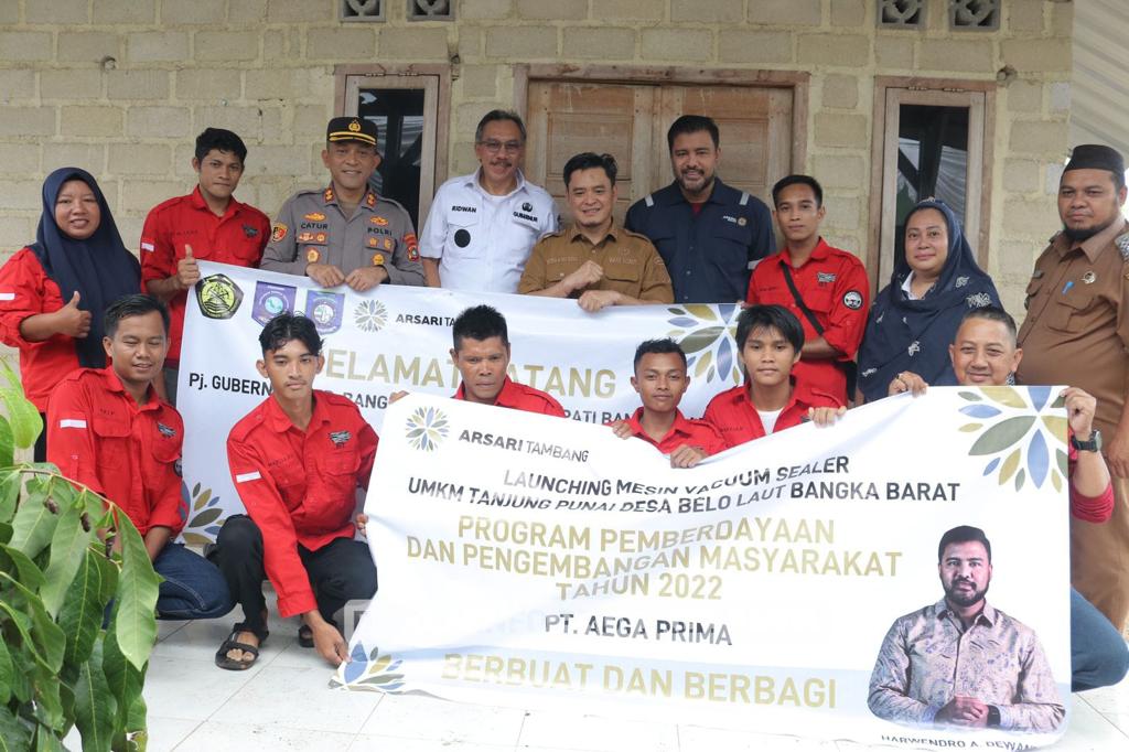 MUNTOK LBC – PT Aega Prima melalui program Pengembangan dan Pemberdayaan Masyarakat (PPM) menyerahkan bantuan berupa dua unit mesin _vacuum sealer_ kepada UMKM Belangkas Berseri pada Selasa (21/2) di Dusun 1 Tanjung Punai, Desa Belo Laut, Kabupaten Bangka Barat.