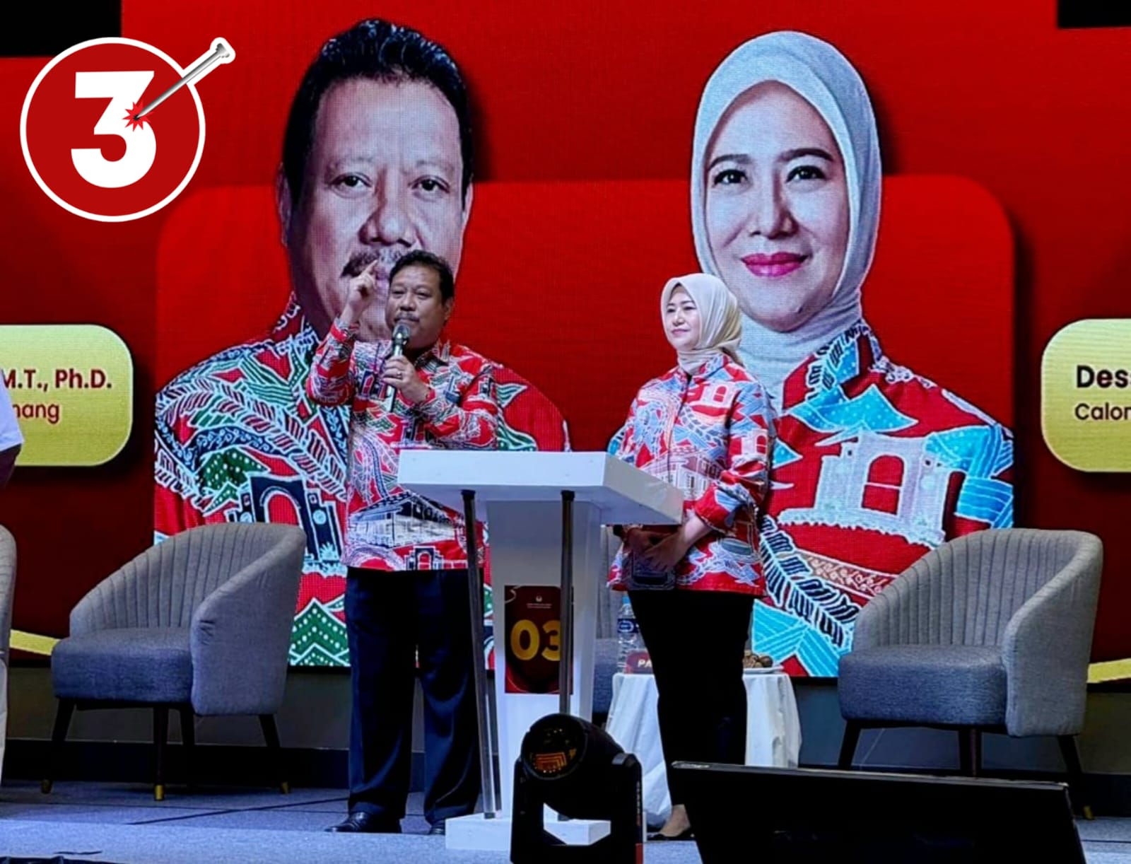 PANGKALPINANG LBC – Pasangan Calon (Paslon) Wali Kota dan Wakil Wali Kota Pangkalpinang nomor urut 3, Saparudin dan Dessy Ayutrisna mengenakan batik daerah dalam debat publik pertama antara paslon Wali Kota dan Wakil Wali Kota Pangkalpinang pada Pemilihan Ulang 2025.